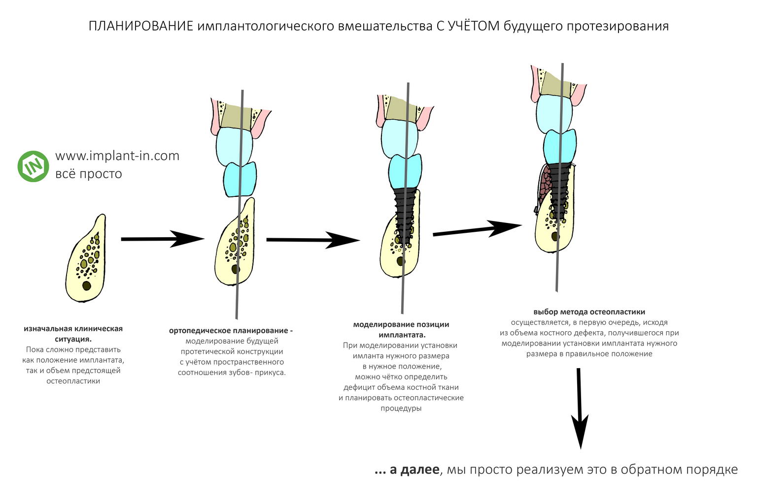 Второе — это то, что схема имплантации привязывается к схеме протезирования. Другими словами, решение о том, какие будут имплантаты, куда их поставить и в каком количестве, принимает тот, кто будет их протезировать. В нашем случае, это врач-ортопед.