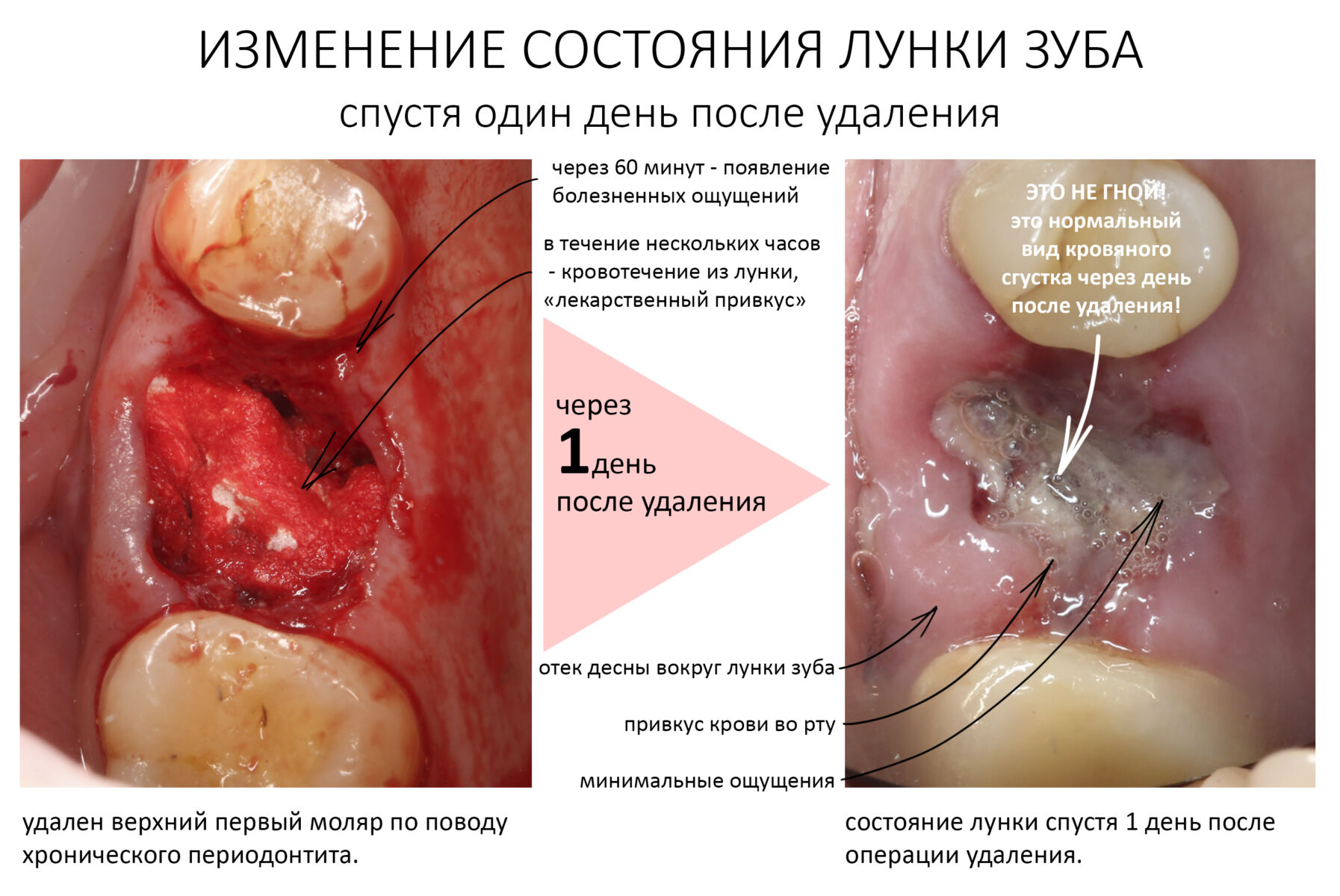 Не забывай, что в полости рта после удаления зуба остаётся рана. Она кровоточит. Во время жевания в полости рта поднимается температура и усиливается кровоток, что, в конечном счёте, приведёт к усилению луночкового кровотечения и увеличению отёка в области удаленного зуба. Кроме того, пищевые остатки могут протолкнуться еще мягкий кровяной сгусток, лунку или рану, инфицировать их со всеми вытекающими.