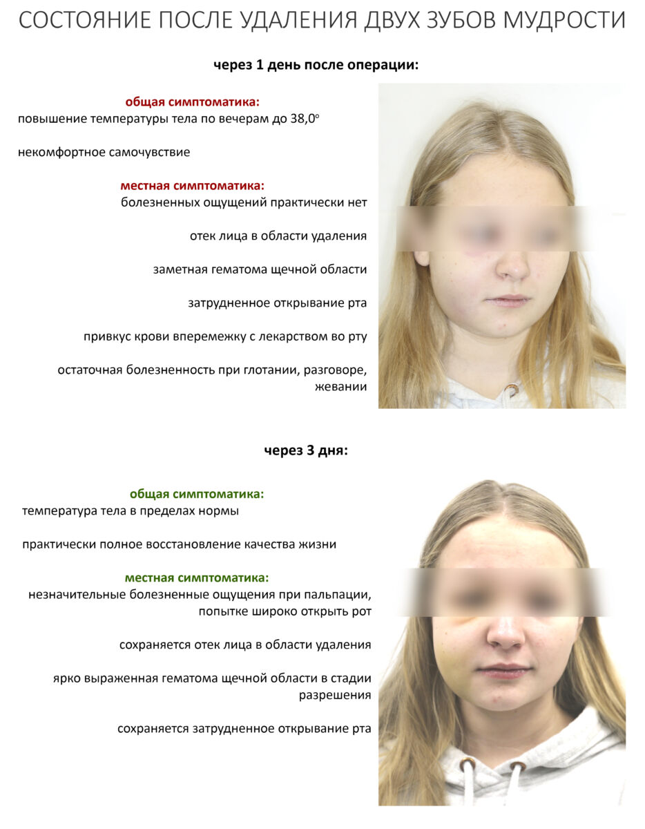 Запомни! Реакция организма на хирургическое вмешательство, а также вероятность развития осложнений не зависят от того, насколько "просто" или "быстро" был удален зуб. Конечно, мы делаем всё для того, чтобы свести к минимуму все риски, но даже очень аккуратная работа хирурга не может свести их к нулю.